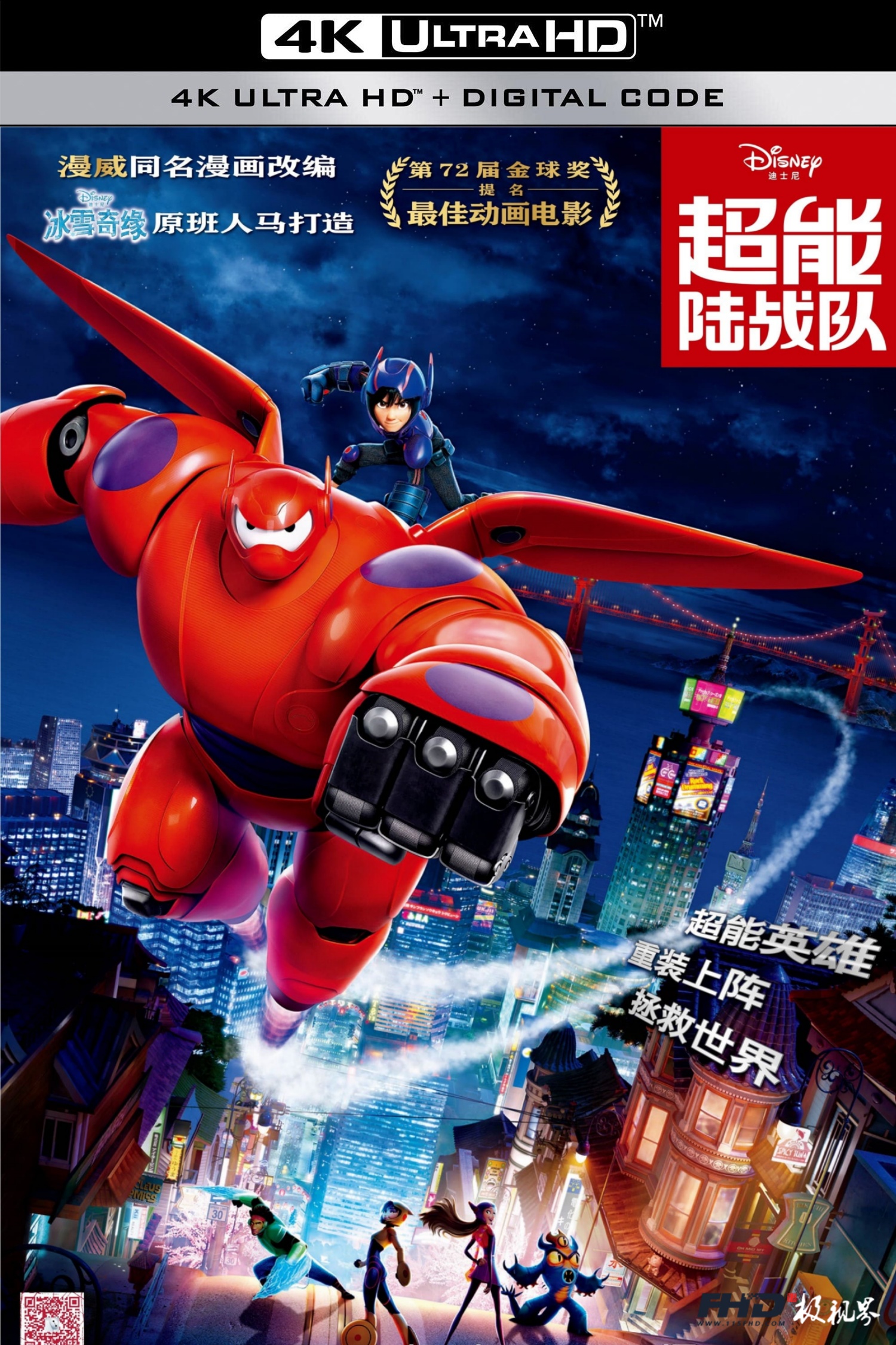 由2013年享誉全球的《冰雪奇缘》及《无敌破坏王》、《魔发奇缘》金奖团队打造,迪士尼影业最新动作喜剧冒险动画钜作《大英雄天团》,故事叙述在一个名叫旧京山的城市,14岁的发明天才少年阿广在同为发明家的哥哥阿正去世之后,与哥哥先前发明的医疗用机器人-杯面成了好朋友。他发现哥哥当时的死因并不单纯,为了阻止旧京山的黑暗势力,阿广与机器人杯面,连同几位富有正义感的伙伴们组成联盟,阿广也运用了他的科技头脑,为团员们设计一系列的武器配备,共同伸张正义。本片由漫威同名漫画原作改编,结合了漫威作品震撼刺激的动作场面及迪士尼一贯的幽默感动,是2014年底全球观众引颈期待的压轴动画大作。