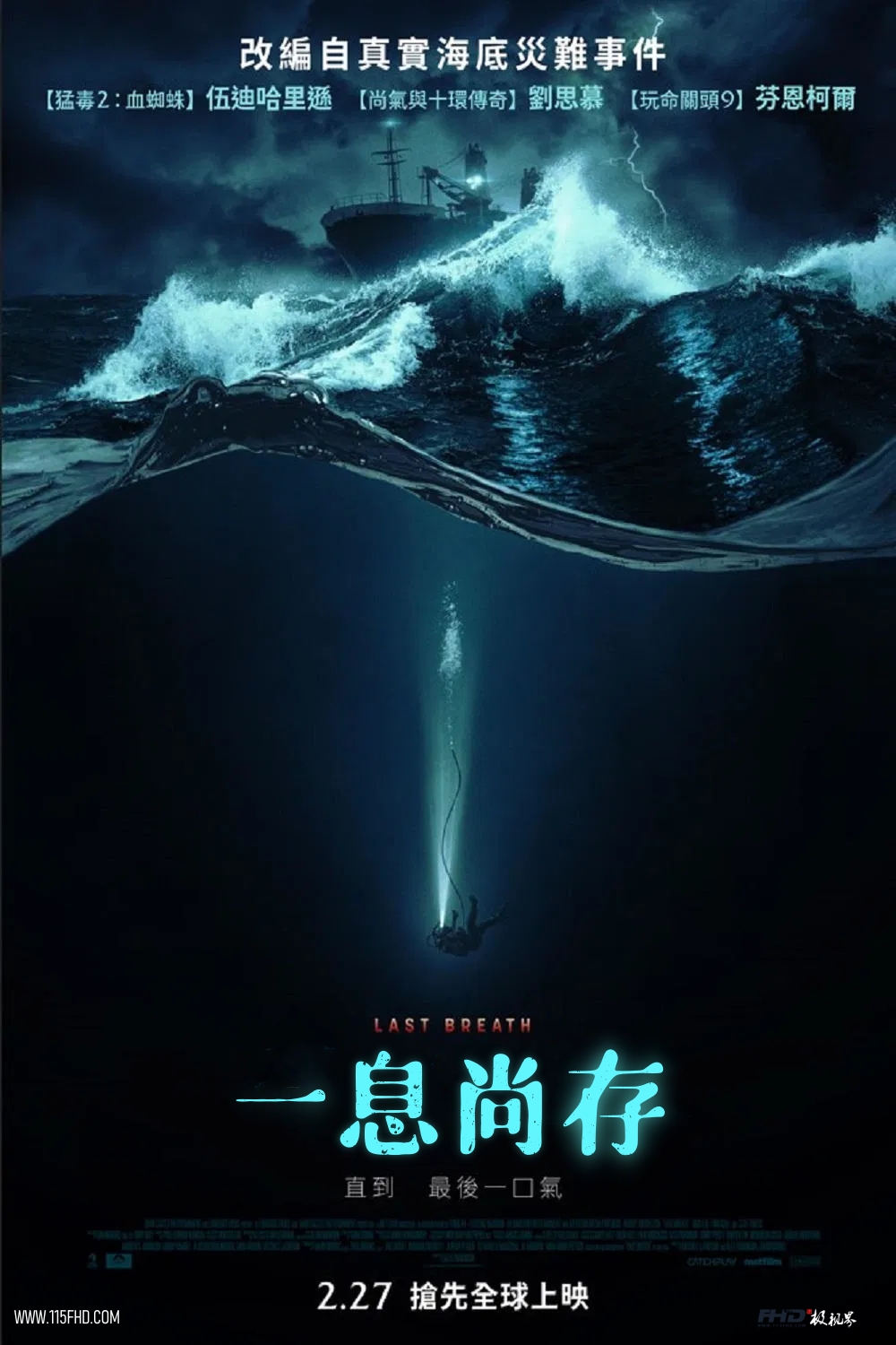 描述潜水员克里斯(芬恩柯尔 饰)在一次「修复爆裂油管」时遇到意外而被困海底,氧气瓶仅剩10分钟可使用,而负责救援的队友邓肯(伍迪哈里逊 饰)与戴夫(刘思慕 饰)离救援现场却至少30分钟。面对滔天巨浪与肆虐风暴,邓肯与戴夫全力以赴、不惜一切,与时间赛跑,只为取得一线生机将克里斯从深海中救出。一段充满惊心动魄又扣人心弦的灾难救援,先从屏住呼吸开始…©115FHD蓝光原盘电影分享站【www.115fhd.com】