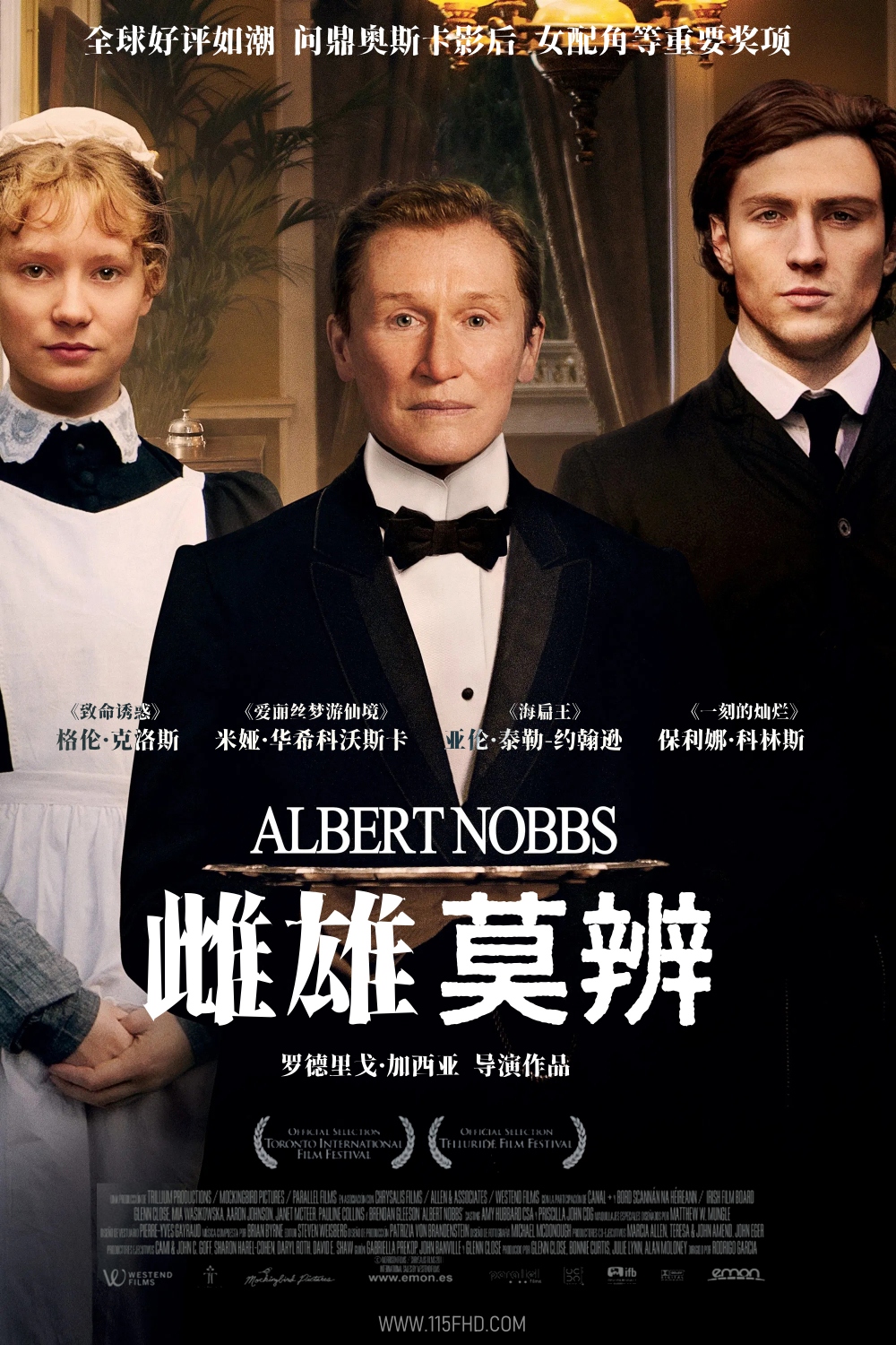 Albert Nobbs(格伦·克洛斯 Glenn Close 饰)在一家专门给上层人士提供寻欢作乐的场所的酒店工作。他生性害羞做事谨慎,深得客人和老板的赏识,并坚守着最大的秘密 ——“他”其实是一个女人。他忙碌但乐在其中,甚至悄悄积攒了一大笔钱,却没有人生目标。直到同样是女扮男装的粉刷工 Hubert Page(珍妮·麦克蒂尔 Janet McTeer 饰)来到酒店,Albert的内心第一次有了期盼,他决心走出自己的孤独世界,寻找自己的人生伴侣。于是他选中了酒店最美丽的女仆Helen(米娅·华希科沃斯卡 Mia Wasikowska 饰),可Helen心系新来的杂工。Albert能完成自己的人生目标吗?©115FHD蓝光原盘电影分享站【www.115fhd.com】