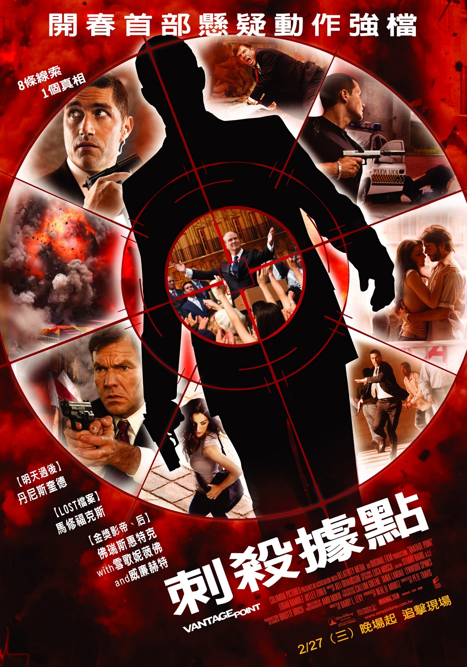 为了应对911之后日益猖獗的恐怖主义,美国总统亨利·阿什顿(威廉·赫特 William Hurt 饰)与西方各国以及阿拉伯国家首脑相约西班牙的萨拉曼卡,将在此缔结全新的反恐同盟。是日阳光明媚,广场人头攒动,不同社会背景之人齐齐聚集,嘈杂万分。阿什顿总统的车队在一片欢呼和反对声中到来,六个月前为保护总统而遭到枪击的资深探员托马斯·巴恩斯(丹尼斯·奎德 Dennis Quaid 饰)冲在最前方,警觉地监视着来自周遭一切可疑之人。谁知,当总统正准备发表演说时,两发子弹击中了他。广场顿时大乱,有人仓皇而逃,有人冲向主席台,有人则趁乱制造祸端。随之而来的爆炸将这美好的一日彻底毁灭。